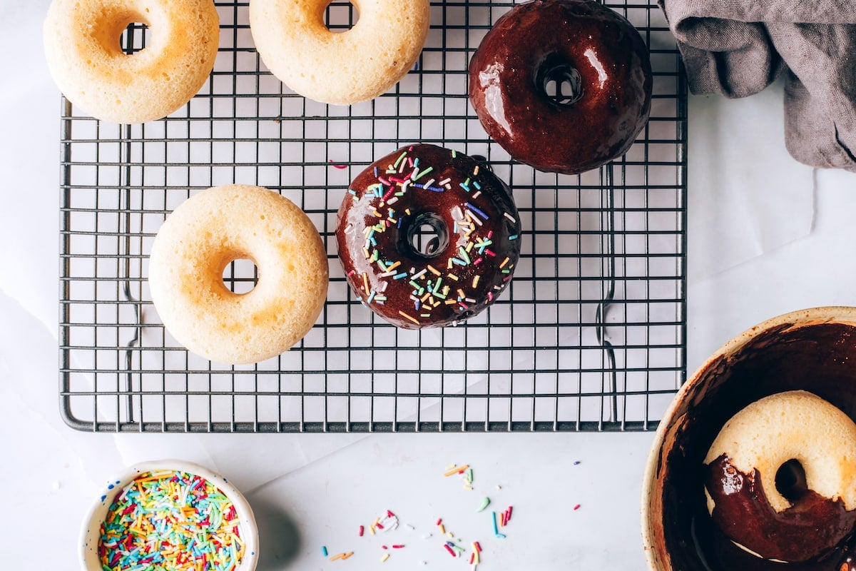 Step 6: Once the donuts are completely cooled, frost donuts and top them with sprinkles if desired. Then place them back on the cooling rack for the glaze to firm up.