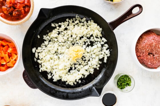 Step 2: Sautรฉ diced onion until fragrant, then add garlic and sautรฉ for another minute.