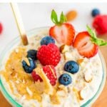 Jar of protein overnight oats topped with berries, almonds and peanut butter.