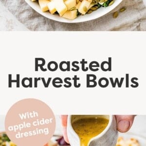 If you’re looking for a warm, comforting dish for fall and winter, these roasted harvest bowls are perfect because most of the ingredients are roasted and added while still warm. Of course, you can also use this recipe for meal prep and serve the roasted components cold or at room temp. I’ve done both and the bowls taste delicious either way.