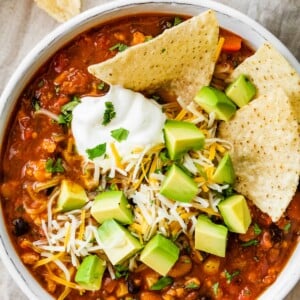 This chicken enchilada soup is packed with flavor and a hint of spice. It tastes just like traditional chicken enchiladas but with a fraction of the effort and can easily be made in your slow cooker, Instant Pot or over the stove top.ย