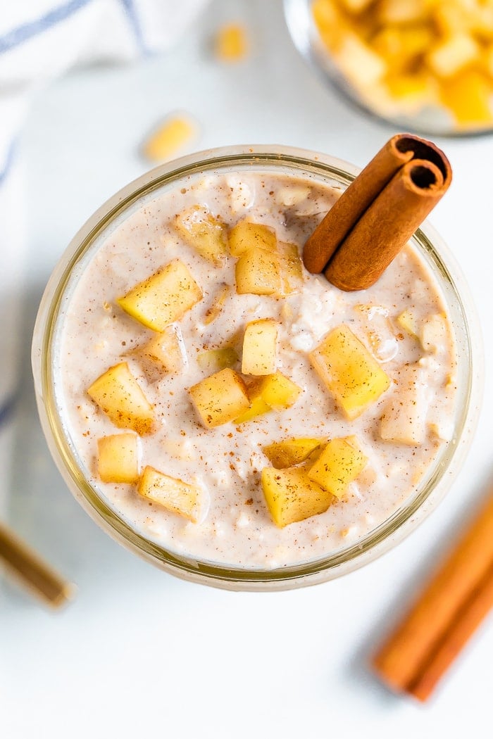 - Serve: Remove lid from jar, add more yogurt or almond milk if the mixture seems too thick. Top with extra 1/4 cup apples and your favorite overnight oat toppings. I love adding a little nut butter or chopped nuts.