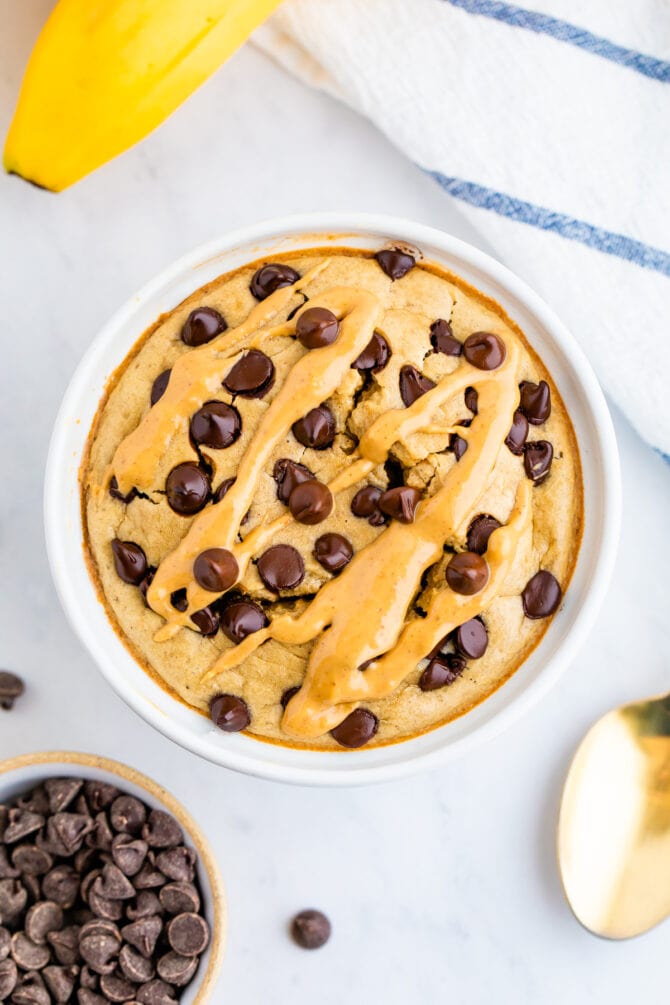 - Bake: Pour batter into greased baking dish or ramekin. I used an 8 oz mini Le Creuset, but any 8 oz oven-safe dish will work. Top with extra chocolate chips and bake at 350ยฐF for 25 minutes or until an inserted toothpick comes out clean.ย
