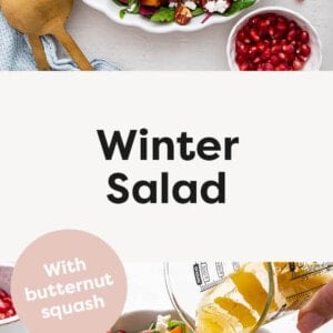 Once your butternut squash is roasted and dressing is made this winter salad recipe comes together in a matter of minutes! Here’s how to make it: