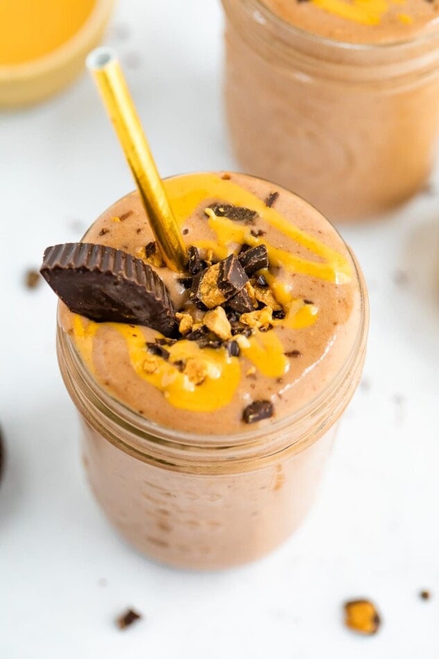 It’s basically a peanut butter cup in liquid form โ rich, creamy and dessert-like, but still healthy enough for breakfast… even with a peanut butter cup blended in!
