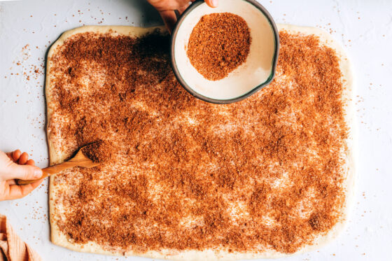 - Spread softened vegan butter on the dough with fingers or a knife then sprinkle cinnamon sugar mixture over butter.