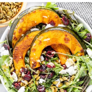 This cozy fall salad combines baby kale, roasted kabocha squash, dried cranberries, pumpkin seeds and feta all tossed in a tangy apple cider vinegar dressing.
