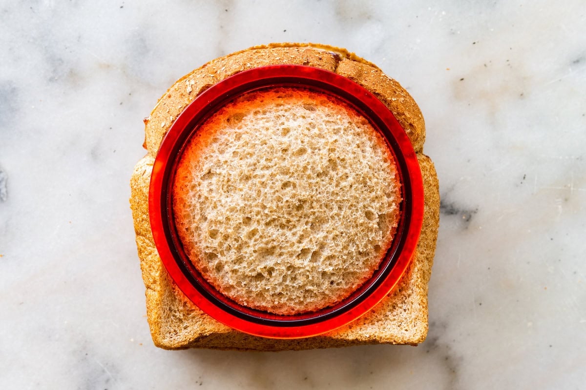 No sandwich sealer? No problem! You can easily make uncrustables with a cookie cutter or glass (like a mason jar) to cut out a circle from the sandwich, removing the crusts. Just make sure to press down firmly to ensure a clean cut. Then you can use a fork to press down and crimp the edges of the bread circle, sealing the sandwich. Make sure to press firmly to prevent the filling from leaking out!