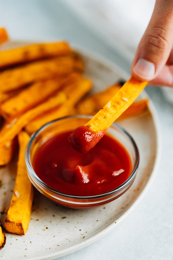You can serve them just like you’d serve regular french fries! I personally eat them with just about everything, but they’re great as a side with burgers (try my spinach feta turkey burgers, sweet potato black bean burgers or these cilantro lime chicken burgers). They’re tasty dipped in ketchup, but any dipping sauce is great. I know some people love dipping their fries into honey mustard, BBQ sauce or a pesto dip.