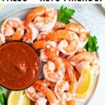 I personally like to arrange everything on a platter as shown in the pictures! Put the cocktail sauce in a small bowl and set that on the plate or platter first. Then arrange the cooked and chilled shrimp around it. Garnish with lemon wedges and fresh parsley for color.