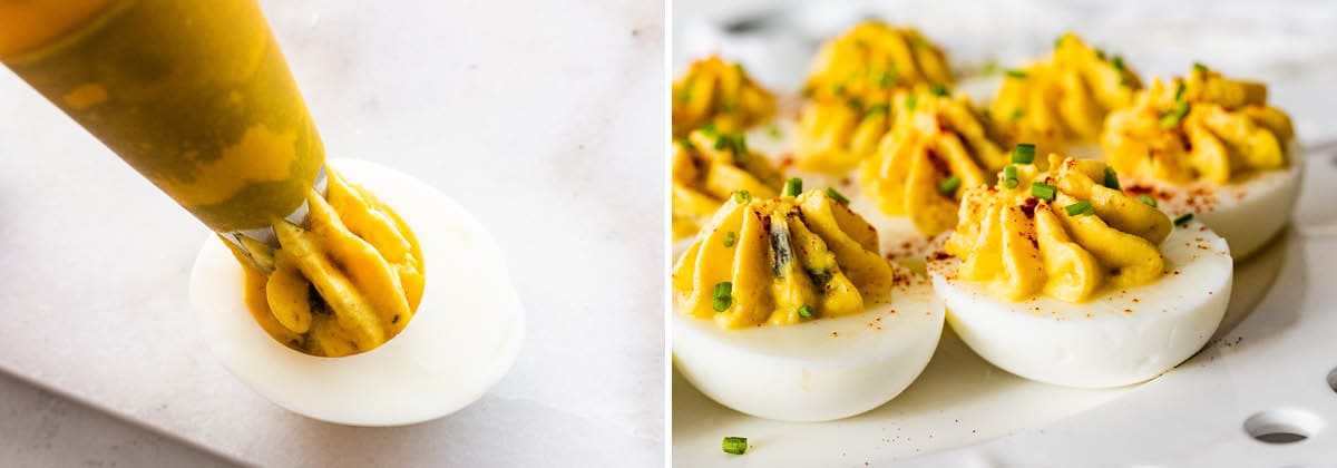 - Piping: If you’re feeling fancy, add the yolk mixture to a plastic bag and cut the corner off to create a piping bag. When ready to serve, pipe the filling into the eggs.