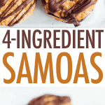 Healthy homemade Samoas made with only four ingredients: coconut, dates, chocolate chips and coconut oil. They’re also vegan and gluten-free!