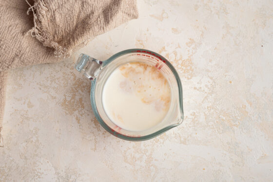 - Whisk almond milk and apple cider vinegar in a medium bowl and let curdle for 5-10 minutes. Set aside.