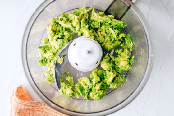 Pulse avocado โ Add avocado and a sprinkle of sea salt to a food processor and pulse a few times to combine.