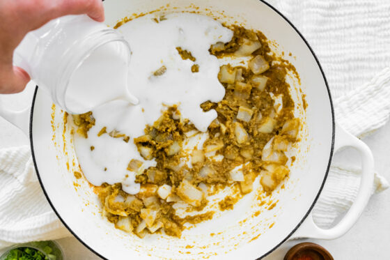 - Heat oil over medium-high heat in a large skillet. Once hot, add onion, garlic and ginger and sautรฉ until fragrant, about 3-5 minutes. Add in curry paste and sautรฉ 1 minute. Add coconut milk, zucchini, cabbage, lime juice, tamari and cayenne pepper to the skillet. Combine and turn up the heat to medium-high so the liquid starts to simmer. Cook for about 5 minutes.