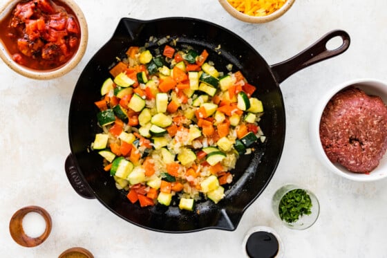 - Add zucchini, bell pepper and ยฝ tsp salt and saute for 5-6 min until veggies have softened.