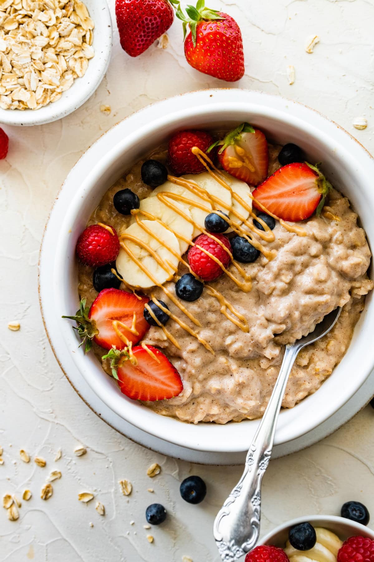 - Nut or seed butter: I love adding a drizzle of nut butter to my oats. My go-to is almond butter or peanut butter, but cashew butter, tahini or sunflower seed butter are all great options.