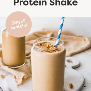 This peanut butter protein shake is made with just five simple ingredients. It’s filling, flavorful and packs in a whopping 30 grams of protein.