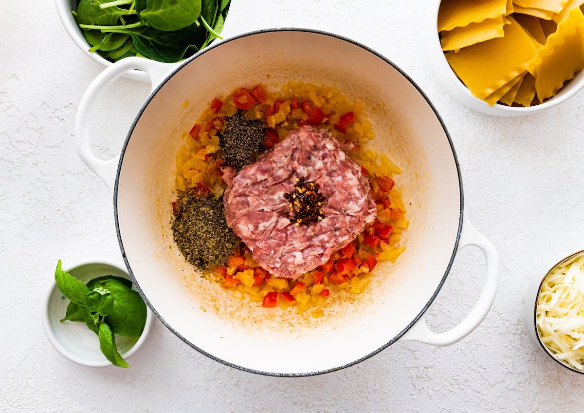 - Italian sausage – I used sweet Italian sausage, which adds a ton of flavor to this soup, but feel free to use hot Italian sausage if you want more of a kick. Ground beef would also be a delicious option and is often found in lasagna. For a lighter option use ground turkey or Italian chicken or turkey sausage instead.