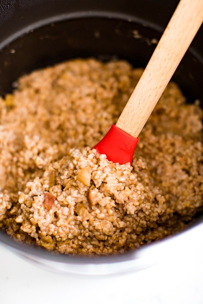 I put the ingredients for the apple cinnamon oatmeal together and started the slow cooker around 10PM, went to bed and upon waking up at 6AM, our house smelled like baked apples and my oats were perfectly cooked and waiting for me to dig in โ quite a lovely circumstance to wake up to if you ask me. The only thing I needed to whip up was a pot of coffee.