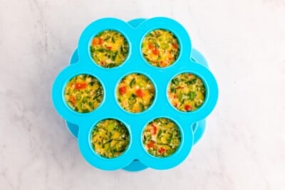 - Pour egg mixture into silicone egg bite molds, fill about each cup โ of the way full while making sure that some of the mix-ins get into each cup. You should get 14 bites. Cover molds with lid.