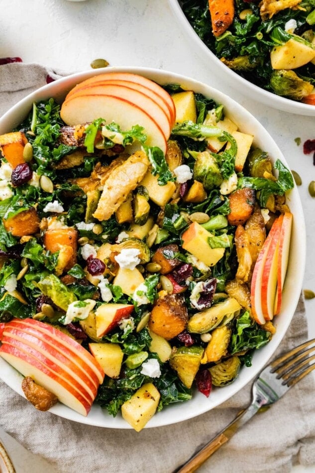 - To make bowls, add a base of kale to each bowl, top with maple turmeric chicken, roasted Brussels sprouts, roasted butternut squash, apple chunks, dried cranberries, pepitas and goat cheese. Drizzle dressing over the bowl and enjoy!