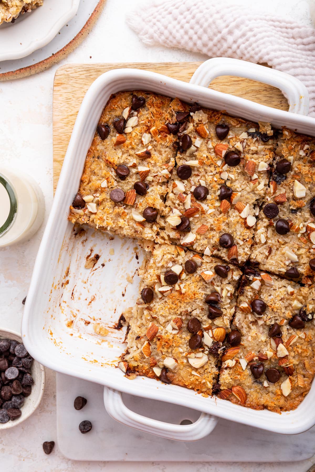 - chocolate chips โ you can’t have Almond Joy baked oatmeal without the chocolate! I usually use either Lilyโs dark chocolate chips for a low-sugar option or Enjoy Life dark chocolate chips for an allergen friendly option.