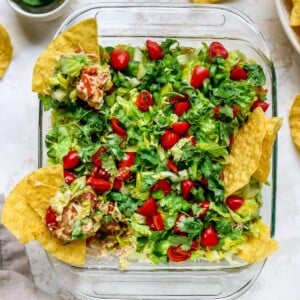 This dip is AMAZING for parties and game-day, but I have to mention that it’s not JUST for parties. During the recipe testing process Isaac and I polished off a whole batch for dinner one night. Which actually isnโt a bad thing considering itโs basically a taco salad โ just in dip form. Itโs got lettuce and everything!