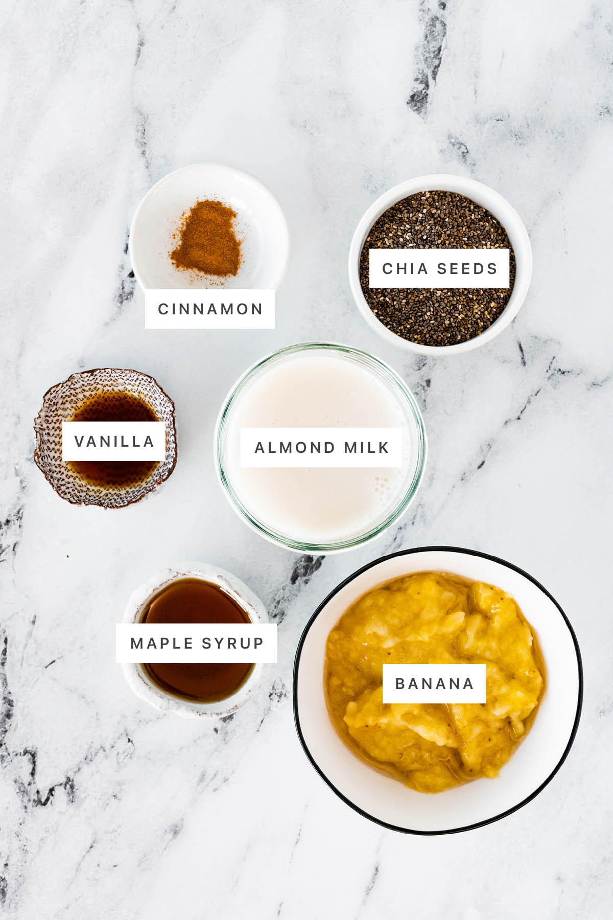 You only need 6 main ingredients to whip up this banana chia pudding. Hereโs what you need:
